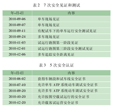 为了保证轨道交通系统的运行安全性,亦庄示范工程必须在其投入运行之前进行独立第三方安全认证,只有取得安全授权部门的验收审批,才能投入运行使用。参照国外发展成熟的轨道交通系统的标准和认证体系,国内也在逐步发展适合本国开发和运行实际情况的轨道交通安全认证体系框架,从而保证国内线路的运行安全。然而,系统的安全认证并不是一味强调绝对的安全,更为重要的是把安全意识和新理念体现在系统设计开发全过程中。系统安全见证和测试及认证见表 2、表 3。