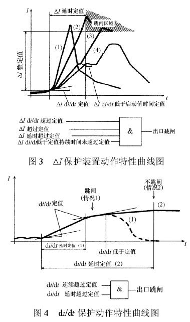 Δ I保护是在电流上升率 di/dt 高于整定值的条件下检测电流增量,在到达峰值电流之前检测到短路。当 di/dt 高于整定值,保护装置启动,并开始计算Δ I,保护装置启动时刻的电流作为基值。达到Δ I 延时后,若 Δ I达到Δ I整定值(Δ Itrip),则保护装置动作。Δ I 保护装置动作特性及跳闸逻辑如图 3所示。图中曲线 2 和曲线 3 满足动作条件,保护装置判断为故障,动作跳闸;曲线1和 4 都不满足动作条件,因此不跳闸。