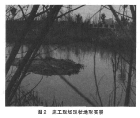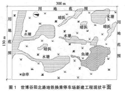 经测量,该施工场地南北长约 300 m,东西长约 130m,地形北高南低,呈散乱形状。地块内芦苇、杂草丛生,老河浜、水塘、暗浜纵横交错(见图 1)。