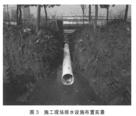 进驻工地以后,首先要解决的就是场地排水问题。而该工地四周,三面全是荒草野地,唯邻近谷阳北路一侧有市政管道。由于场地内水塘、河沟与周边水系相通(水面标高 2.5 m 左右),因此,要排除场内积水,必须首先通过围堰切断与外界水系的联系,然后调集大功率抽水设备,多处、多点,不停顿抽水。据初步统计,在此工程中,为排除积水,共动用人力 95 个班次,调用流量超过 15 m3/h潜水泵 7 台,其它小型抽水机若干台,真可谓投入多,花费精力多,见图 3 所示。