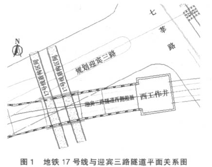 根据线路总体布置,规划轨道交通 17 号线在迎宾三路隧道 XK0+416.400~XK0+392.700 之间,采用两根单圆盾构穿越,且两者净距较小,最近处仅 2.5 m。该范围内隧道的基坑深 16~17.2 m,属软土地区深基坑,一般采取地下连续墙围护。隧道施工须考虑后期实施规划轨道交通 17 号线盾构顺利穿越条件,同时确保该隧道基坑开挖及后期结构的安全。