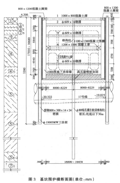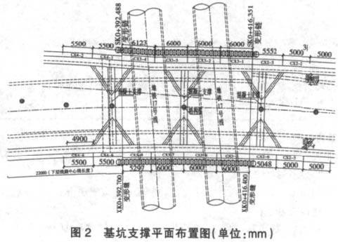 基坑支撑平面布置见图 2 所示,基坑围护横断面见图 3 所示。