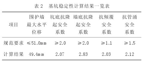 根据上海市工程建设规范《基坑工程技术规范》(DG/TJ08-61-2010),综合考虑周边环境条件,确定基坑保护等级为二级,基坑围护最大水平位移≤0.3%H(H 为基坑开挖深度)。基坑须达到的稳定要求及其设计计算结果见表 2 所列。