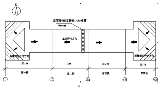 地铁二号线咸阳路站基坑开挖长度463.1m,开挖深度17.71m,两端各有一个盾构井(如图1所示),设计为明开挖。针对开挖线路长和深度较深、地下水位高和淤泥质粘土土质等情况,研究制定了超长基坑坝式分段开挖法。先将基坑划分为四个施工段,在二、三施工段中间设置一道高压旋喷水泥坝,将基坑分为东区和西区两部分,即起到临时支撑的作用,又能使两边的施工互不干扰。