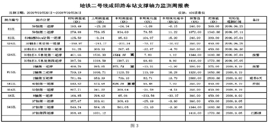 随着基坑开挖,共需架设四道钢管支撑,水平间距3000mm。随着支撑的安装,用轴力计进行监测,定期整理数据。对接近或超过报警值的部位立即报警,经过现场认真分析,一是地下土质不均匀产生的侧压力有一定的出入;二是挖土顺序不当顺墙深挖面积过大;三是支撑安装不及时。通过调整挖土进度,使被动土压力起到一定作用,对相邻支撑点做预压应力调整,有效地控制了支撑系统应力平衡稳定的问题。(如图3)