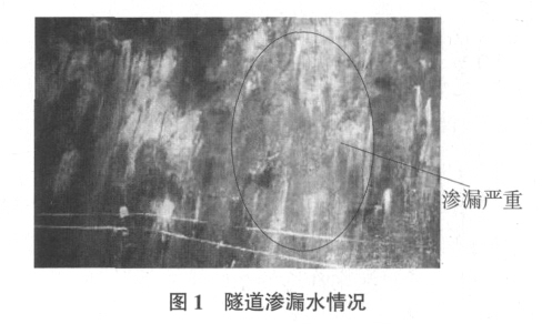 深圳地铁某区间隧道,在施工过程中发现西丽站台向西 400 m 左右的内衬表面出现了明显的渗漏水现象。现场查看发现,内衬表面的渗漏水主要表现为湿渍、渗水、流淌(图 1)及局部有射流,具体表现为:仰拱施工缝渗漏、环向施工缝渗漏和混凝土裂缝渗漏、混凝土结构疏松及空鼓渗漏。