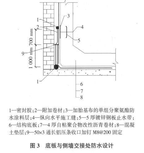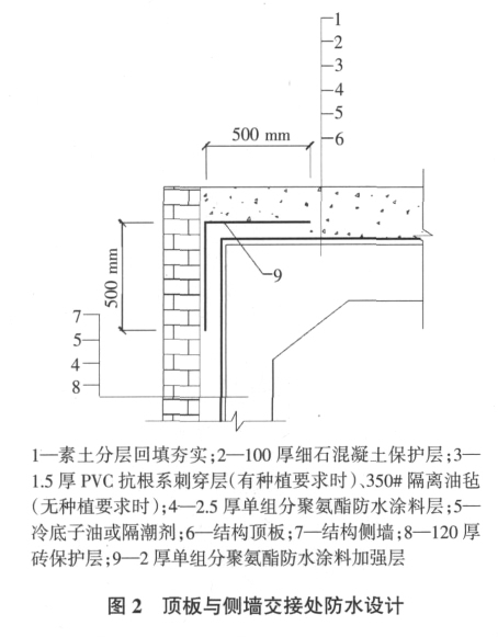 某地铁车站顶板和侧墙均设计使用了单组分聚氨酯防水涂料作为防水层。图 1 为该地铁车站防水设计;图 2 为该工程顶板与侧墙交接处防水设计;图 3为该工程底板与侧墙交接处防水设计。
