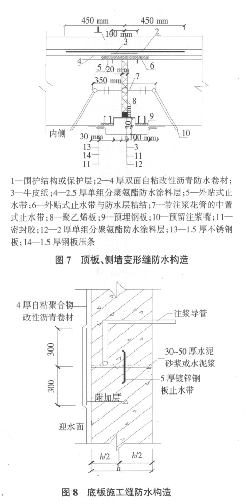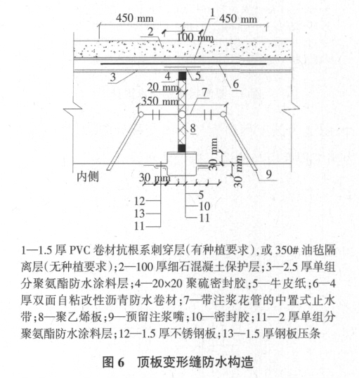 图 6 为顶板变形缝防水构造图,图 7 为顶板、侧墙变形缝防水构造图。