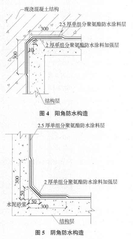 阴阳角处涂刷 2.0 mm 厚单组分聚氨酯防水涂料作加强层,用量约3.0 kg/m2,并加铺一层玻纤布。图 4为阳角防水处理示意图;图 5 为阴角防水处理示意图。