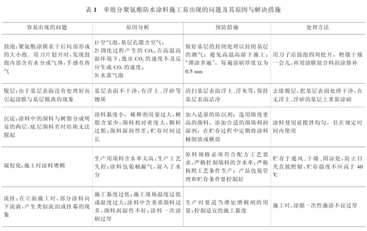 单组分聚氨酯防水涂料因施工不当易出现问题,如鼓泡、脱层、流挂等。表 1 列出了单组分聚氨酯防水涂料易出现的问题及其原因与解决措施,供实际工程应用该类材料时参考。