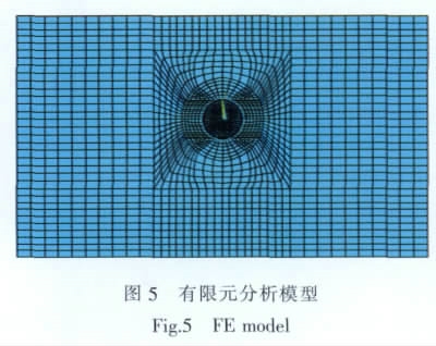 选用ANSYS 有限元程序对膨胀力和膨胀接触压力进行二维平面应变数值模拟分析, 其中隧道和地层采用Plane42 单元, 地层和结构之间的接触关系采用Targe169 和 Conta171 单元模拟,隧道开挖采用ANSYS 程序生死单元功能来实现。有限元分析模型如图5 所示。