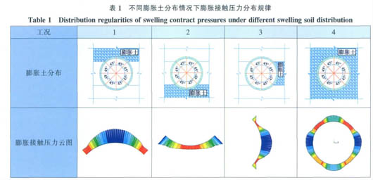 作用在结构上的膨胀接触压力基本呈二次抛物线分布, 但在膨胀土交界部位, 小范围内会出现畸变。 若结构全周均为膨胀土, 膨胀接触压力最大将发生在结构左右两侧,其次在结构的顶、底部,最小在结构的45°、135°、225°、和 270°处。 表 1 为结构外周不同膨胀土分布情况下结构膨胀接触压力的分布规律。