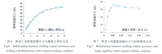 计算结果表明,膨胀接触压力与膨胀土的分布、厚度、膨胀力变化、自身及结构刚度等密切相关,通常情况下, 膨胀接触压力约为膨胀力大小的 30%~ 70%。