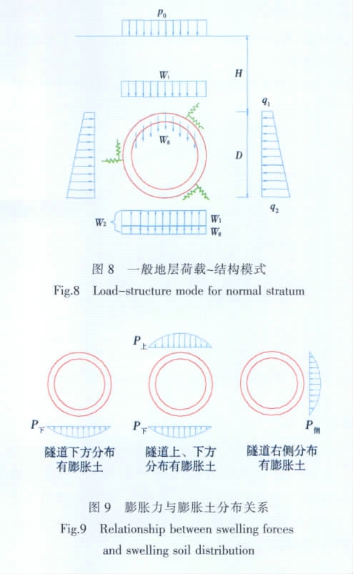 一般地层荷载-结构模式如图 8 所示, 膨胀力与膨胀土分布关系如图9 所示。
