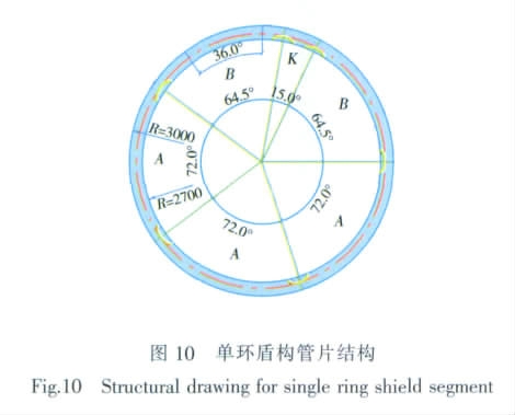 一环管片由1 个封顶块 (圆心角 15°)、2 个邻接块(圆心角64.5°)和 3 个标准块 (圆心角 72°)管片组成,纵向接头为 10 处,按 36°等角度布置;在平面曲线半径小于或等于400 m 的曲线段采用1.2 m 的管片幅宽, 在直线和平面曲线大于 400 m的区间段采用1.5 m 的管片幅宽 ;一般段采用错缝式拼装,管片环采用“直线+左右转弯环”形式拟合平面曲线。