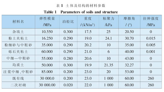 本次模拟采用3D-σ三维数值分析软件, 以实际土层情况为基础,原始应力场只考虑重力,模拟开挖严格按照施工方案及施工工序, 做到最大限度地与实际施工情况相一致。 土体分布与既有结构位置见图1。 从上到下共六层土,分别是杂填土、粉土夹粘土、粉细砂与中粗砂、砾石夹粘土、中细—中粗砂、均质土(表 1),计算有限元模型见图 2。