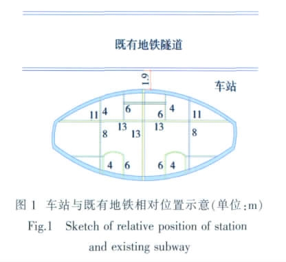 车站施工的难点主要集中在新建车站近距离(净距1.98 m)暗挖施工下穿既有地铁环线结构。 车站与既有线位置关系见图1。