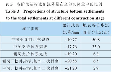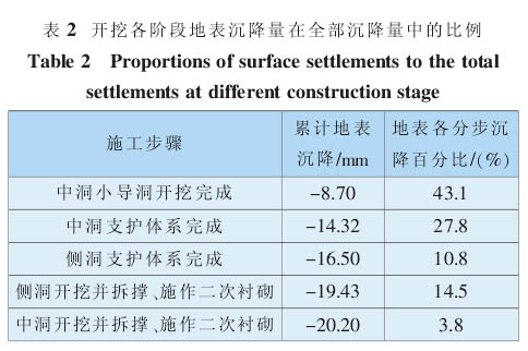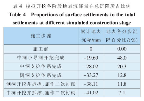 图3 中施工步序中的第 4、6、8、11、13 步分别对应于中洞导开挖、中洞支撑完、侧洞支撑完、侧洞开挖及二次衬砌、中洞开挖及二次衬砌(在图 1 中已标出)。 各阶段地表沉降量在总沉降量中所占的比例如表2 所示。