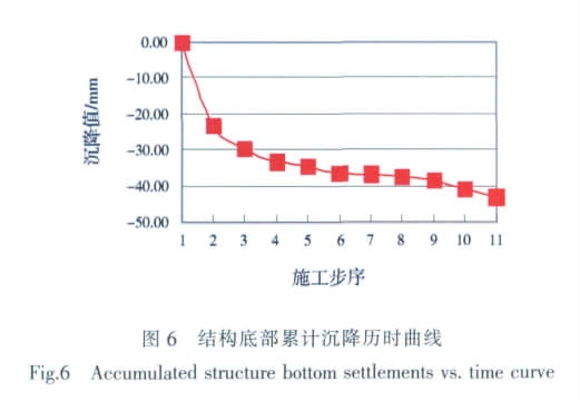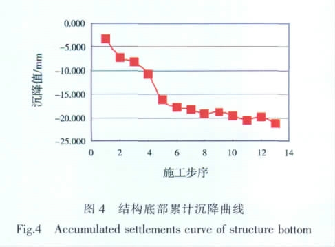 地表和结构底部的沉降曲线变化趋势基本一致,只是结构底沉降略大于地表沉降。
