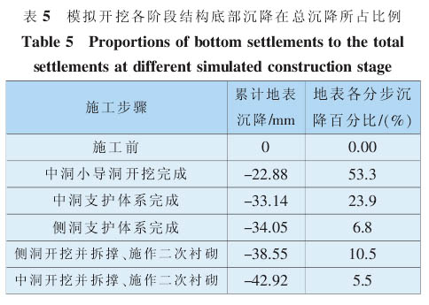 由图5、图 6 和表 4、表 5 显示,中洞支护体系的施作导致的沉降在全部沉降量中占绝对优势, 分别为68.3%和 77.2%;施作侧洞支撑体系的沉降较少,为12.8%和 6.8%;待支撑体系完成后 ,中洞和侧洞的开挖、拆撑以及施作二次衬砌所占比例较小,分别为18.9%和 16.0%。