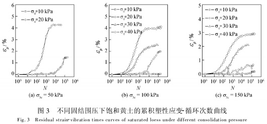 整理不同固结围压下排水循环三轴试验数据,得到试样中的εp-N曲线(图3).试验发现,以围压50kPa固结的试样只能承受10 kPa和20 kPa的动应力.
