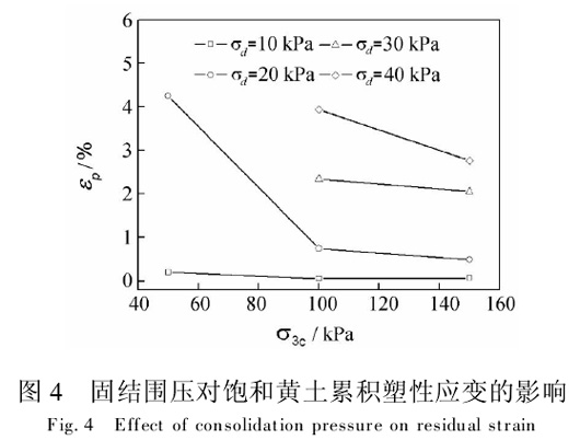 取动应力循环作用至10 000次时,各试样的累积塑性应变进行研究.此时,试样均处于稳定阶段.作出各试样的累积塑性应变随固结围压的变化曲线(图4).
