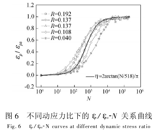 由εp/εps-N曲线(图6)可知,在单对数坐标系中,不同动应力比R下,饱和黄土的εp/εps随循环次数N的变化规律都比较接近.同时,εp/εps-N曲线形态与反正切函数十分相似,因此采用反正切函数来描述εp/εps与N之间的关系,即