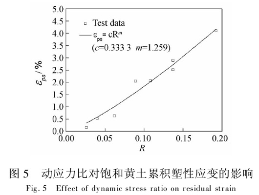 对本试验,c=3.333×10-1,m=1.259.拟合结果与试验数据之间的相关系数之平方为0.964,说明公式可以很好地反映动应力比对饱和黄土稳定阶段累积塑性应变的影响.