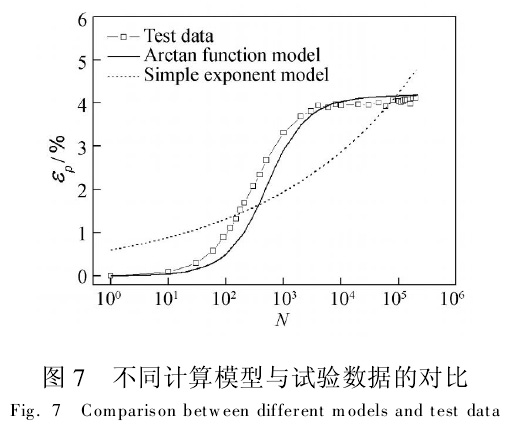 通过不同模型与试验数据间的对比(图7)可知:在半对数坐标系εp-lgN中,简单指数模型是一个随循环次数单调递增的函数.特别是当循环次数较大(大于80 000次)时,简单指数模型的计算结果迅速增大,导致其与试验数据差异很大,因而不能反映饱和黄土累积塑性应变的稳定阶段.而本文建立的反正切函数模型与试验数据吻合较好,能够比较精确地描述饱和黄土残余应变的发展过程.同时,反正切函数模型仅需三个土体参数即可确定,应用比较方便.