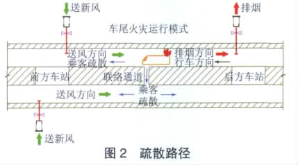 在紧急情况下,平台侧的列车门打开,乘客从侧门离开火灾列车下到疏散平台,再由疏散平台经联络通道疏散至对侧隧道或临近车站。见图 2。