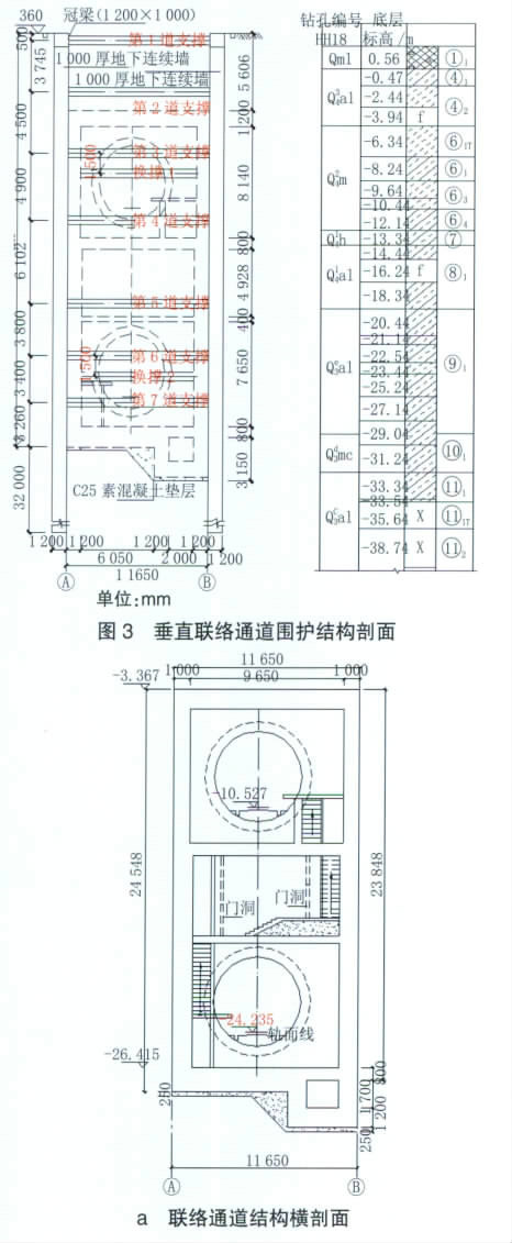 联络通道为地下 3 层矩形框架结构,明挖基坑为14.9 m×11.65 m,深 30.207 m,泵房处基坑深 32.7 m,围护结构为 1.2 m 厚地下连续墙,连续墙底穿透第二承压含水层进入其下不透水层,墙深约 62 m,采用内支撑方案,共设置 7 道支撑,第 1 道支撑为钢筋混凝土支撑,第 2~7 道支撑及换撑均为Ф800 mm,厚 16 mm 的钢管支撑。盾构进出洞两侧端头土体采用高压旋喷桩进行加固。