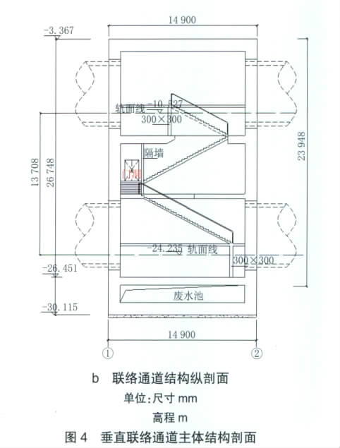 联络通道采用左右线内部上下连通方式,为地下 3层,长 14.9 m,宽 11.65 m,高 24.548 m,-3 层为左线隧道,-2 层作为连接左右侧疏散平台的转换层,同时为设置防火门的位置,-1 层为右线隧道,顶板覆土厚度约为5.7 m。