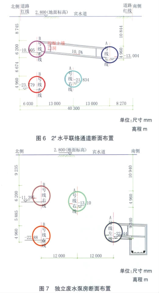 本区间 A 号线左、右线线路最低点位置不重合,因此左右线需分开设置废水泵房,而在废水泵房设置位置,左、右线上下高差较大,约为 9.3 m 和 9.4 m 且平面线间距为 13 m 和 12 m,如将联络通道与废水泵房合建,则需要采用明挖法,工程规模较大,不经济。