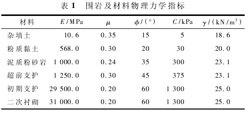 根据该处隧道临近的地质勘探 CR26 钻孔地质分层、各层地层勘探统计物性指标,计算所采用的地层和结构物理力学参数具体见表 1。考虑到其中微风化泥质粉砂岩仅有岩块试验指标,泥质粉砂岩岩体计算指标按其围岩分级 V 级的隧道规范值取值,结构物性指标取相应混凝土类型和强度等级的规范值。上层隧道拱部施作的超前小导管,下层隧道拱部施作的超前大管棚,计算中均按 0. 3 m 地层加固有效厚度,根据经验取相应地层 E( 弹性模量) 、C( 黏聚力) 、Ф( 摩擦角) 、γ( 重度) 、μ( 泊松比) 参数提高 25% 。