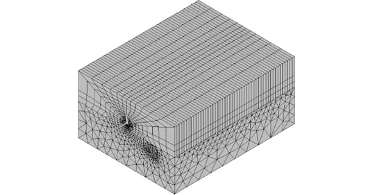 计算 采 用 ANSYS 三 维 有 限 元 模 型,隧 道 埋 深13. 9 m。侧面边界为水平位移约束,底面边界为竖向位移约束。模型上部边界为自由边界。初期支护和围岩均采用 SOLID185 实体单元。整个计算模型共有59 882个单元。模型及网格划分见图 1。