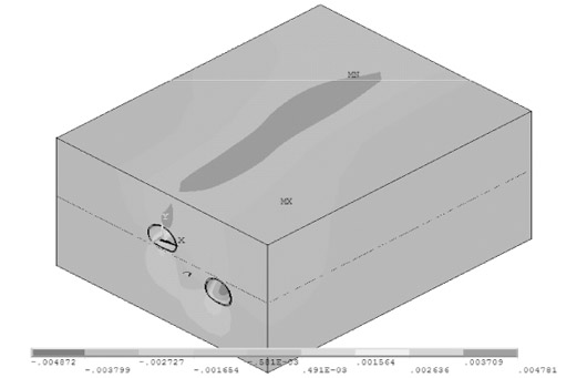 图 5 区间线隧道施工完成后的地层竖向位移( 单位: m)
