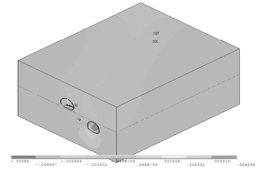图 7 区间隧道施工 100 m 时出入线隧道的竖向位移( 单位: m)