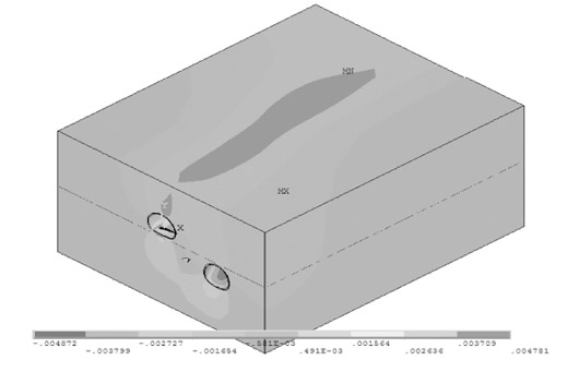 先建出入线隧道开挖支护后,地表沉降见图 2,地层的竖向位移见图 3。后建区间隧道开挖支护后的地表沉降见图 4,地层的竖向位移见图 5。