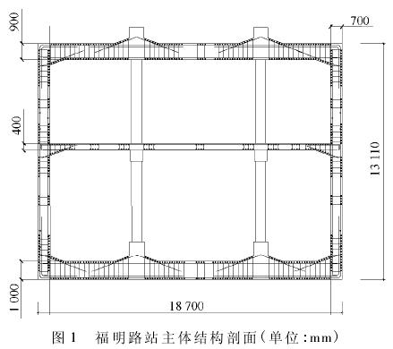 宁波市轨道交通 1 号线一期工程起于市区西部的高桥镇,终点站为东外环路 站。线 路 全 长 约 21. 00km,设车站 20 座,其中地下站 15 座,高架站 5 座。 该工程先行节点福明路站位于中山东路和福明路路口处,沿中山东路东西向布置,为明挖地下二层 10 m 岛式车站。车站长 186. 43 m,基坑按两期开挖。一期基坑长 108 m,车站主体结构变形缝按诱导缝构造设计,墙、板沿诱导缝自东向西分设 6 块浇筑,标为 A ~ F段。主体结构底板厚1 100 mm,侧墙厚 700 mm,顶板厚 900 mm,中板厚 400 mm,底板、侧墙、中板混凝土强度等级为 C35,顶板混凝土强度等级为 C40,主体结构剖面见图 1。
