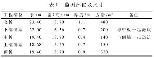 地铁工程的混凝土裂缝规律与一般地下工程的裂缝规律有着明显的共性,但在裂缝控制的难度上有些不同: 地铁车站的跨度大、埋深大,普遍存在大体积混凝土问题,且层间距大,一般 6 ~ 7 m,在约束状态下,会产生较大的收缩应力,造成混凝土的裂缝更加严重,影响混凝土裂缝的因素更加复杂[1]。同时,地铁混凝土多为超长薄壁结构,不易养护,又存在基坑沉降因素,侧墙及顶板的开裂风险相对更大。据此,对福明路站各结构分别开展控温防裂措施,各结构选取代表性的一块进行温度监测,监测部位及结构尺寸如表 1 所示。