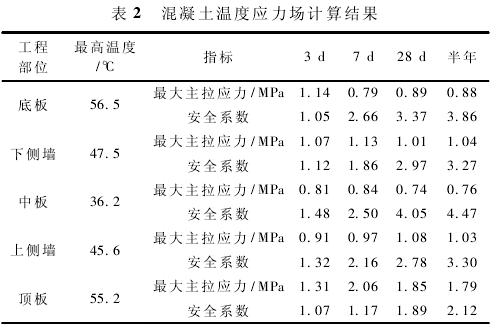根据地铁站各结构的特点,分别选取墙体混凝土的 1 /2 和底板、中板、顶板混凝土 1 /4 进行网格剖分,采用大体积混凝土施工期温度场及仿真应力场分析软件模拟实际施工过程,进行仿真计算。计算时考虑浇筑温度、浇筑时间、平均气温、混凝土水化热的放热规律、混凝土结构约束、基坑内风速、混凝土弹性模量等影响因素[2]。计算结果如表 2 所示。