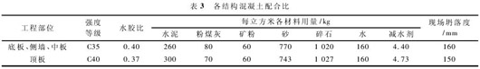 在以上原则的指导下,利用优选原材料经反复试验,配制出抗渗性好、体积稳定性高和抗裂性能优良的混凝土[3-5]。结合混凝土浇筑要求,最终确定的配合比见表 3。