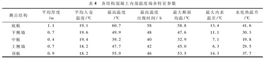 为检验施工质量和温控效果,掌握温控信息,以便及时调整和改进温控措施,做到信息化施工,在各结构内分别布设温度传感器,一共 39 个点,每个结构部位外均再加一个气温测点。温度测定在混凝土浇筑同时立即执行,连续不断。混凝土的温度测试,温峰前每 2h 监测一次,温峰出现以后每 4 h 监测一次,直到温度变化基本稳定为止。温度传感器测得的各结构混凝土内部温度场各特征参数如表 4 所示。