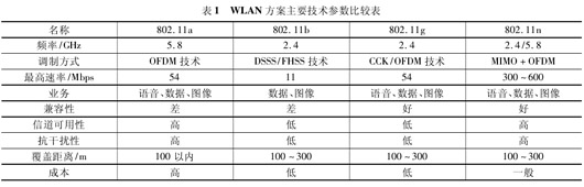 IEEE 的 802. 11 工作组是无线局域网标准的开发组织之一,开发的主要是 IEEE 802. 11 标准。经过多年努力,IEEE 802. 11 已经发展成为了一个系列标准,表1 是常用的四个标准的主要技术参数。其中 2. 4GHz 是一个开放的 ISM( 企业、科学和医疗) 频谱,只要其无线接入点( AP) 的发射功率及带外辐射满足无线电管理机构的要求,则无需提出专门的申请即可使用此 ISM 频段; 而 5. 8 GHz 的频谱需要向国家无线电管理委员会申请有偿使用。