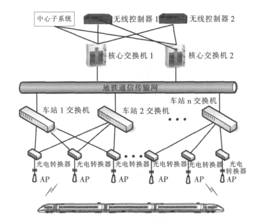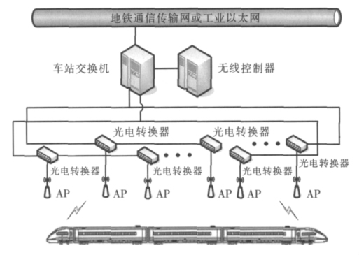 采用 WLAN 方式时,在隧道沿线布置无线 AP 设备,在车站设置交换机设备,在控制中心设置无线控制设备,列车上安装车载天线和无线接入设备。