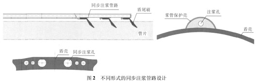 为何相同隧道直径的盾构直径差异较大,从6 340 ~6450 mm 不等? 这与盾构设计理念等相关,其中一个主要原因是以海瑞克为代表的硬岩盾构为保证尽量小的壳体阻力,其同步注浆管路设计在盾壳内; 而以小松为代表的软土盾构无需过多考虑壳体阻力,其同步注浆管路设计在壳体外,如图 2 所示。