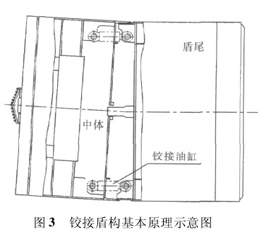 为方便安拆吊运,盾构主机分前体、中体和盾尾三部分; 盾尾与中体通过铰接油缸连接,盾尾可产生弯折称为铰接盾构; 盾尾与中体采用焊接等方式刚接的为非铰接盾构。