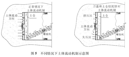 图 5 右图所示,由于刀盘开口、土仓内搅拌棒、渣土改良系统等某个装置设计不当,给土仓内渣土滞留、结泥饼等创造了条件; 土仓内渣土不能循环流动,形成泥饼堵塞,开挖面上部土体无法直接进入土仓,盾构推进过程中在上部形成挤压区; 开挖面下部土体由于螺旋机出土失压,由刀盘旋转从上部带到下部的土体和下部开挖面土体进入土仓由螺旋机输出,在下部形成失压区; 在压缩性及流动性较低的土层掘进时,在右图所示情况下几乎不能推进; 在软塑或塑性土层掘进时由于土体挤压后具有流动性,仍可以掘进进尺; 但若不及时解决,导致总推力、扭矩大增大,土仓温度高的同时,由于上部挤压下部失压,引起盾构机昂头推进、姿 态失控,随即造成地面沉降失控。