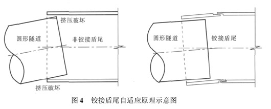 ( 3) 由于铰接盾尾可根据受力自适应弯折角度,有利于盾尾间隙的保持,保护管片拼装质量; 如图 4 所示,在因纠偏需要等情况下,非铰接盾尾轴线与隧道管片轴线产生夹角较大时,管片棱角极易与盾壳产生挤压破损; 而铰接盾尾可一定程度的保持盾尾轴线与隧道管片轴线平行,减小挤压破损管片的可能性;