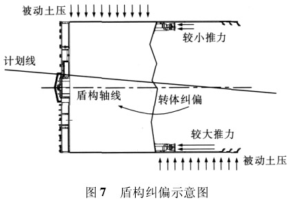 ( 4) 相同直径的盾构机,灵敏度( 盾构机长度与直径比值) 越小则其适应性和可操控性越强,这和千斤顶推力差控制是相关的。盾构机要实现转体纠偏,必须克服转体方向的被动土压,相同直径的盾构长度越大,产生的被动土压( 迎土面积) 越大,需千斤顶分组的推力差就越大,如图 7 所示; 故较小的灵敏度及较大的推力差对盾构姿态控制及纠偏意义重大。